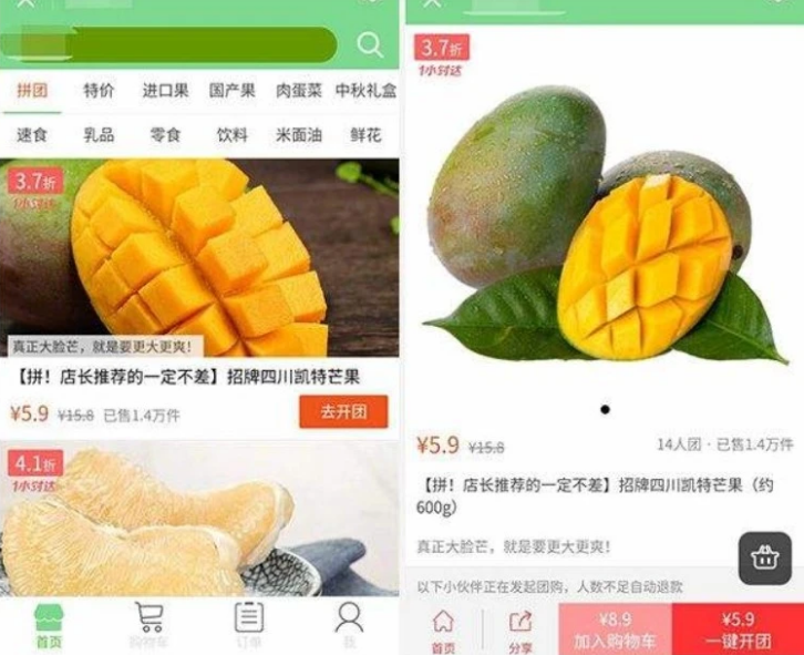 利用拼團(tuán)活動(dòng)激發(fā)客戶邀請(qǐng)好友一起下單的行為。比如:原價(jià)15.9元的芒果,5人團(tuán)購價(jià)5.9元。這種活動(dòng)往往能讓一批準(zhǔn)備下單的客戶,非常積極的去邀請(qǐng)好友一起下單。對(duì)生鮮企業(yè)、商家來說,客戶邀請(qǐng)好一起下單的行為,意味著能夠可以同時(shí)賣出多份產(chǎn)品。在這個(gè)前提下,往往就大大提升產(chǎn)品銷量。