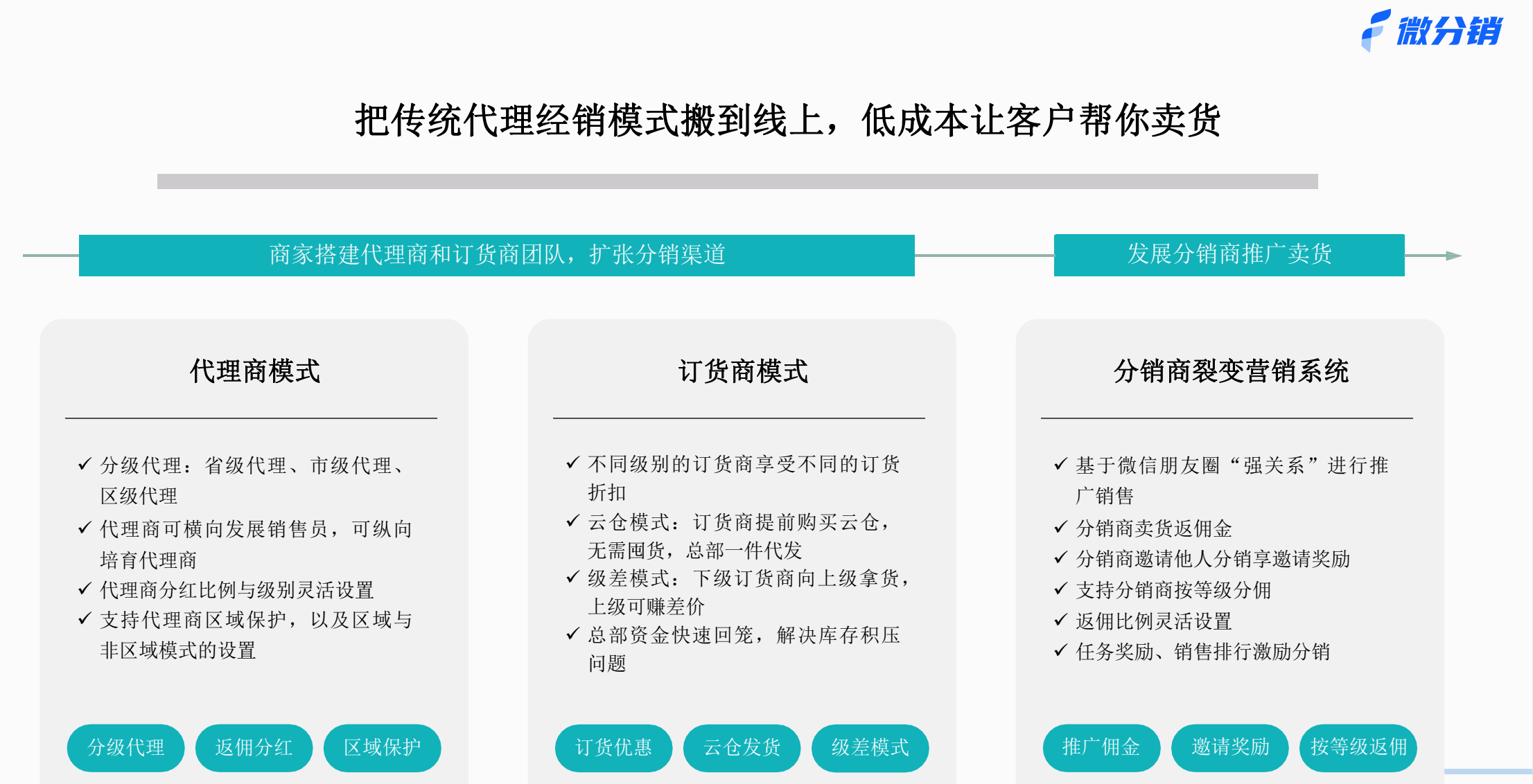微分銷商城帶有分銷體系,經典二級分銷,打造超強分銷戰隊、裂變式分銷賣貨,分銷裂變鎖粉、供應商入駐、招代理商、內置百余種營銷功能,微信小程序開店、營銷、管理一鍵搞定,助力商家招募更多分銷商幫忙賣貨,零成本就可以把客戶轉變為分銷商、代理商,突破招商難的渠道瓶頸。