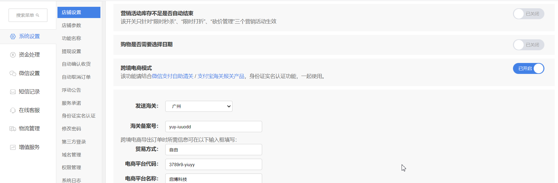 (1)開啟“身份證號碼”、開啟“跨境電商模式”、開啟“身份證實名認證”、開啟“驗證訂購人姓名”