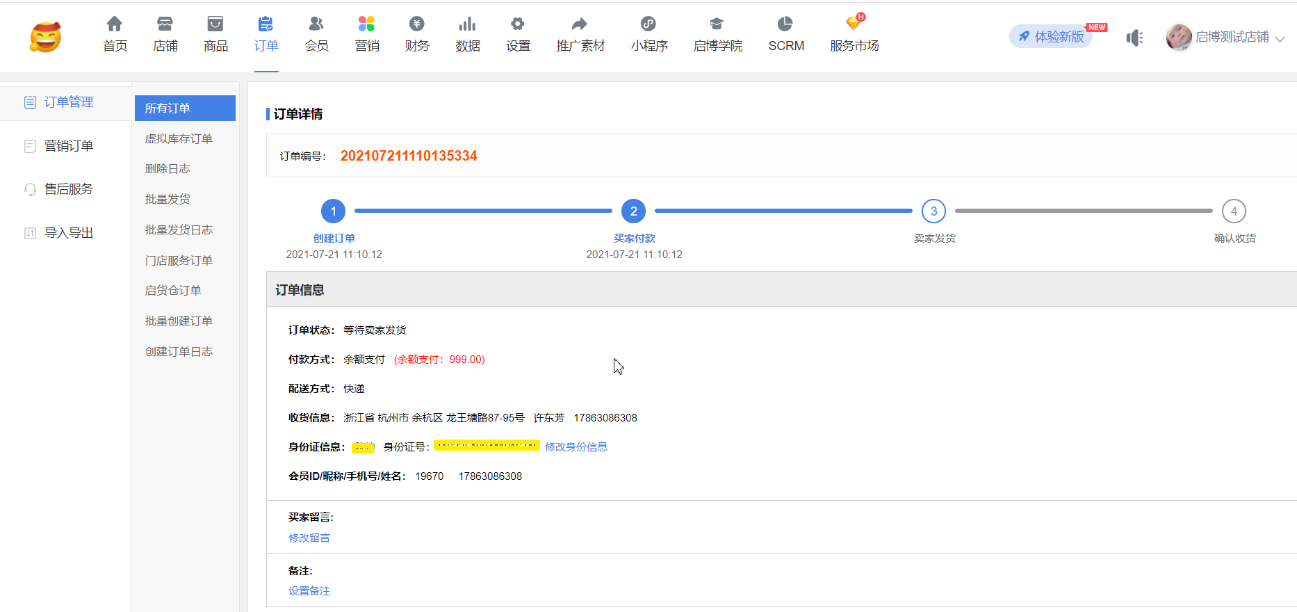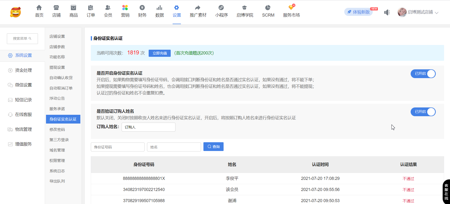 用戶場景:系統設置-店鋪設置-開啟”跨境電商模式”、”身份證號碼”;同時,系統設置-“身份證實名認證”,”是否開啟身份證實名認證”和”是否驗證訂購人姓名”開啟后,在手機端訂單詳情可以修改”訂購人”信息,后臺訂單詳情同步修改后”訂購人”信息。