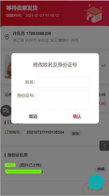 (3)手機端物流詳情點擊編輯,彈出修改姓名及身份證號彈窗