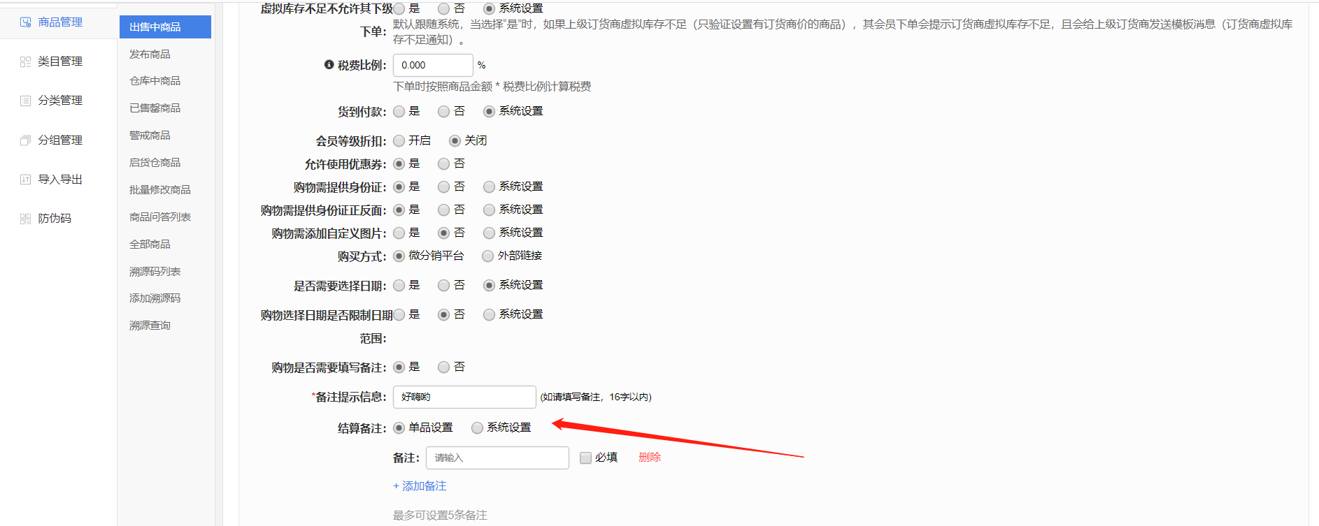 現邏輯:商品購物設置-新增“結算備注”設置,支持針對單品設置還是走系統設置