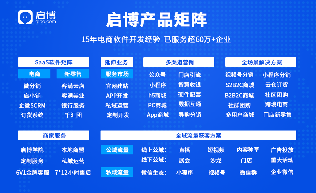 隨著微信電商基礎(chǔ)設(shè)施不斷完善,啟博已擁有15年的電商軟件開發(fā)技術(shù)經(jīng)驗(yàn),啟博自開發(fā)的微分銷商城系統(tǒng)可以為企業(yè)品牌提供從獲客、連接到轉(zhuǎn)化、維系的全鏈路解決方案與服務(wù)。