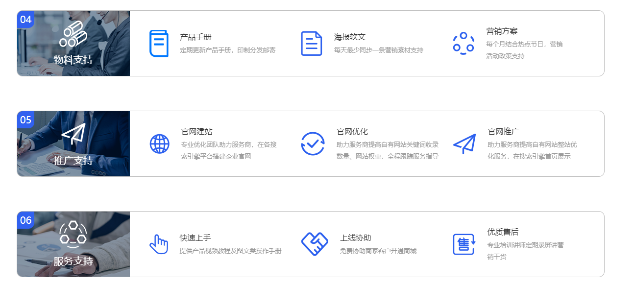 啟博作為新經(jīng)濟(jì)形態(tài)下的電商數(shù)字化解決方案公司,在賦能各類B端商戶的同時(shí),對(duì)外宣布將啟動(dòng)“共創(chuàng)共贏 讓創(chuàng)業(yè)更簡單計(jì)劃”,并有“優(yōu)厚政策”對(duì)代理商進(jìn)行重點(diǎn)扶持,共同掘金社交電商新賽道。啟博電商SaaS渠道招商產(chǎn)品有微分銷商城代理、小程序代理、客滿云店代理、客滿美業(yè)代理、千匯團(tuán)代理、官網(wǎng)建站、官網(wǎng)優(yōu)化業(yè)務(wù)代理等,涵蓋公私域主流解決方案和經(jīng)營場(chǎng)景。