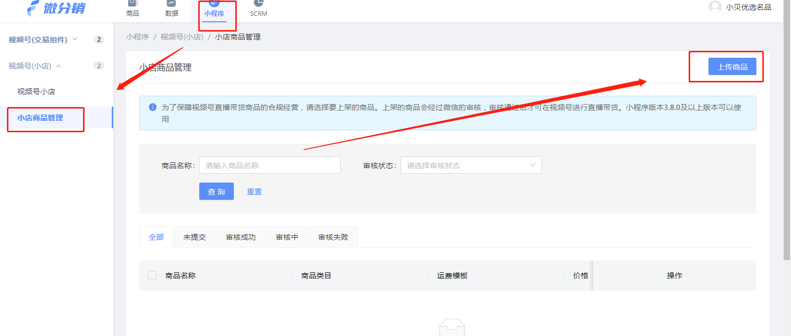 商家可通過小店綁定啟博微分銷/啟小鋪,實現小程序店鋪商品馬上推送至視頻號直播間、視頻號小店和小程序商城的一盤貨經營、統一商品。