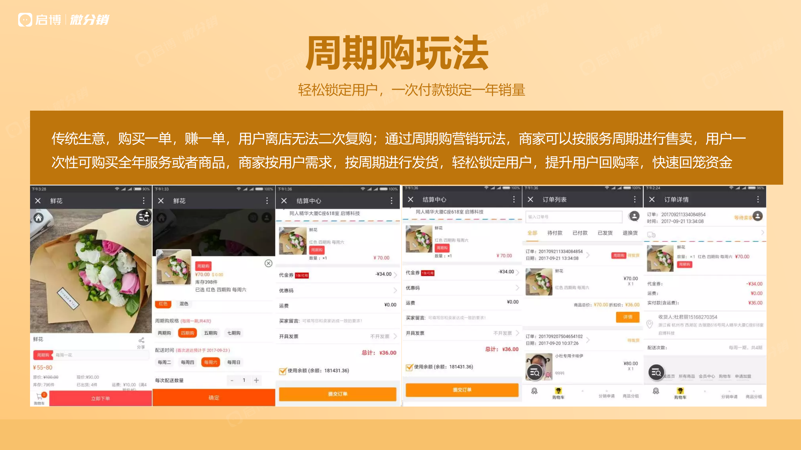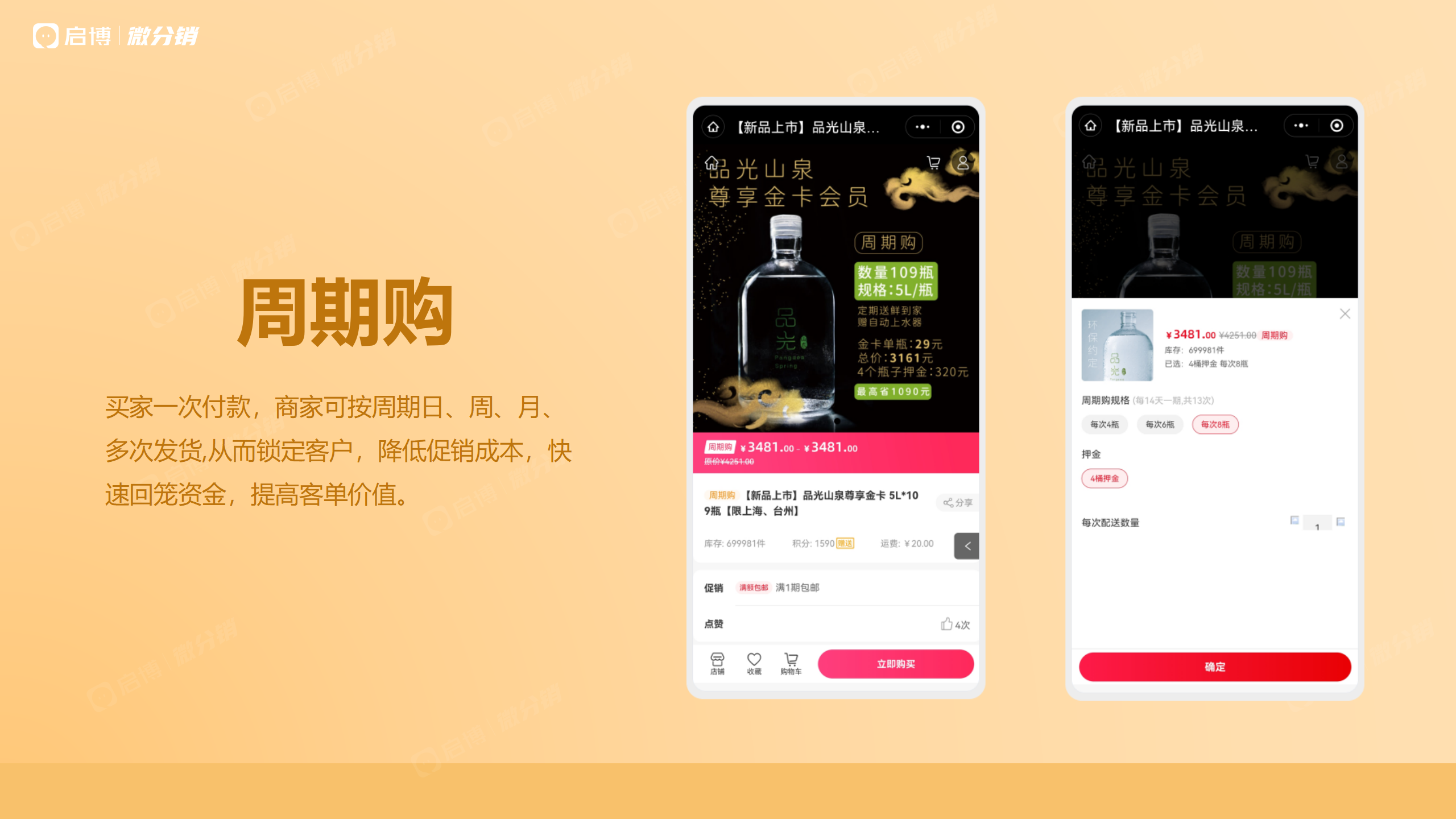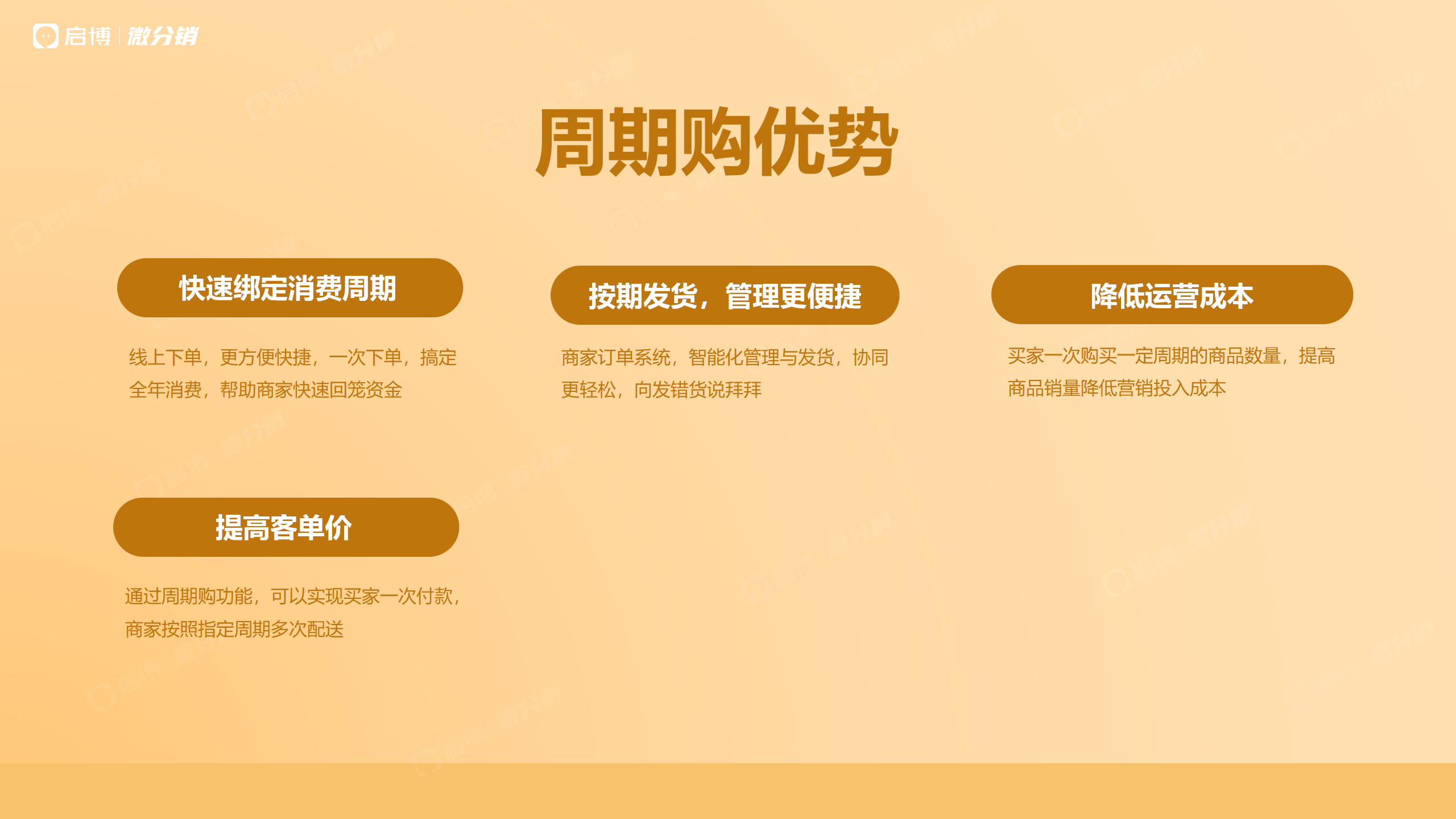 為了幫助商家解決這樣的經營困境,啟博微分銷“周期購”功能助力商家打造“線上運營+配送到家+周期購”模式,實現“買家一次性付款,商家多次發貨”的消費場景,對于買家而言,則無需重復下單,還能享受更優惠的價格;對于賣家而言,可以實時盤活庫存,減輕資金壓力。