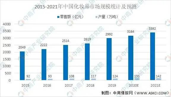 根據國家統計局數據顯示,2015年-2019年期間,我國限額以上化妝品類零售總體保持增長趨勢,2019年限額以上化妝品行業零售總額為2,992億元,產量達124萬噸。預計在2021年我國化妝品零售總額和產量分別可達3392億元和142萬噸。