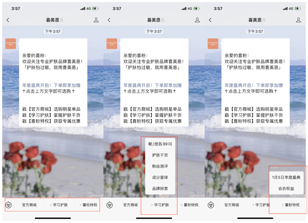 關注「喜美恩」公眾號后,在自動歡迎語中引導用戶點擊菜單欄“官方商城”選購下單、“學習護膚”掌握護膚干貨、“喜粉特權”獲取專屬優惠。