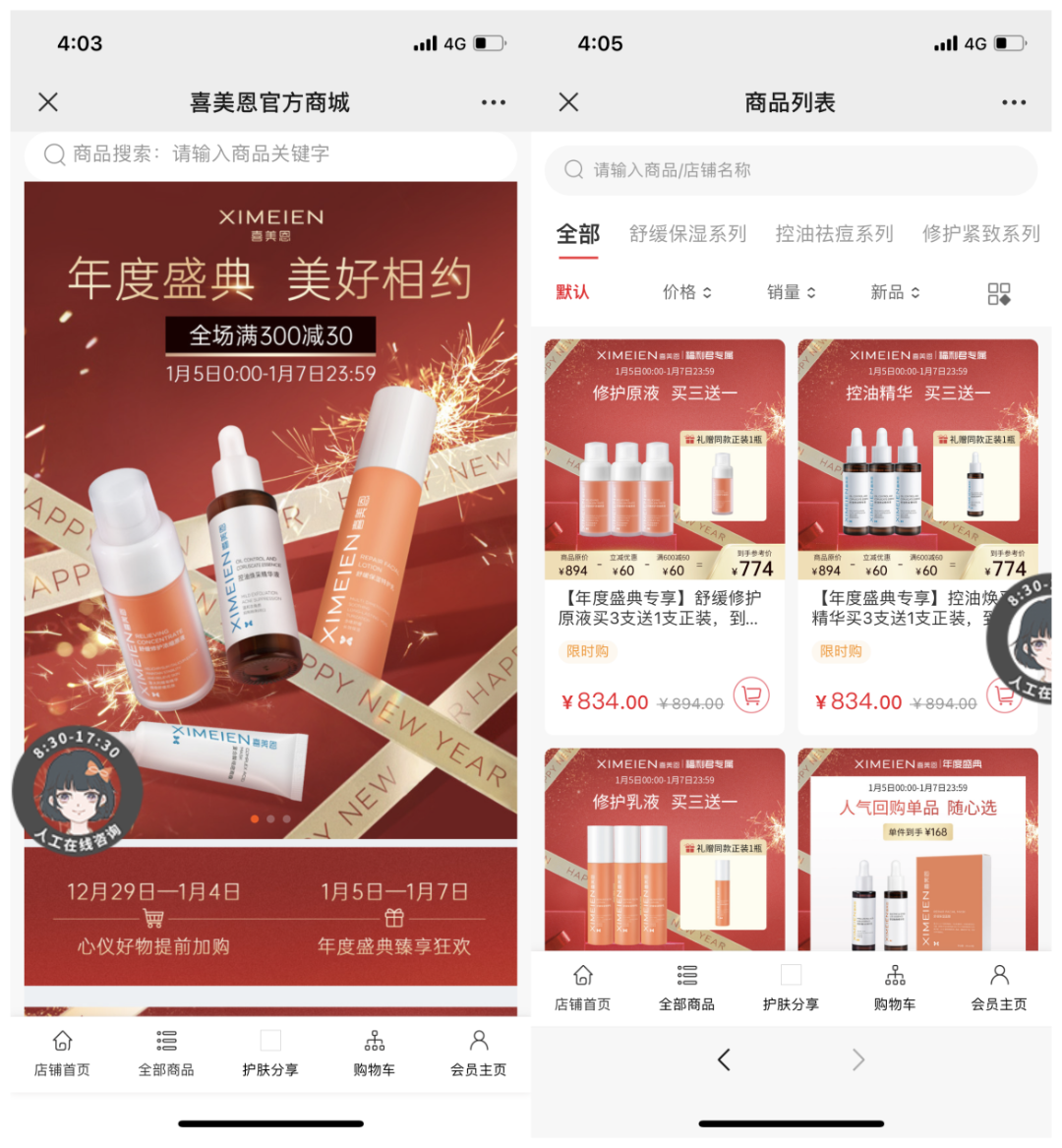 喜美恩合作啟博微分銷系統,搭建了喜美恩官方商城,商城分布由“店鋪首頁”、“全部商品”、“護膚分享”、“購物車”、“會員主頁”五大模塊構成。