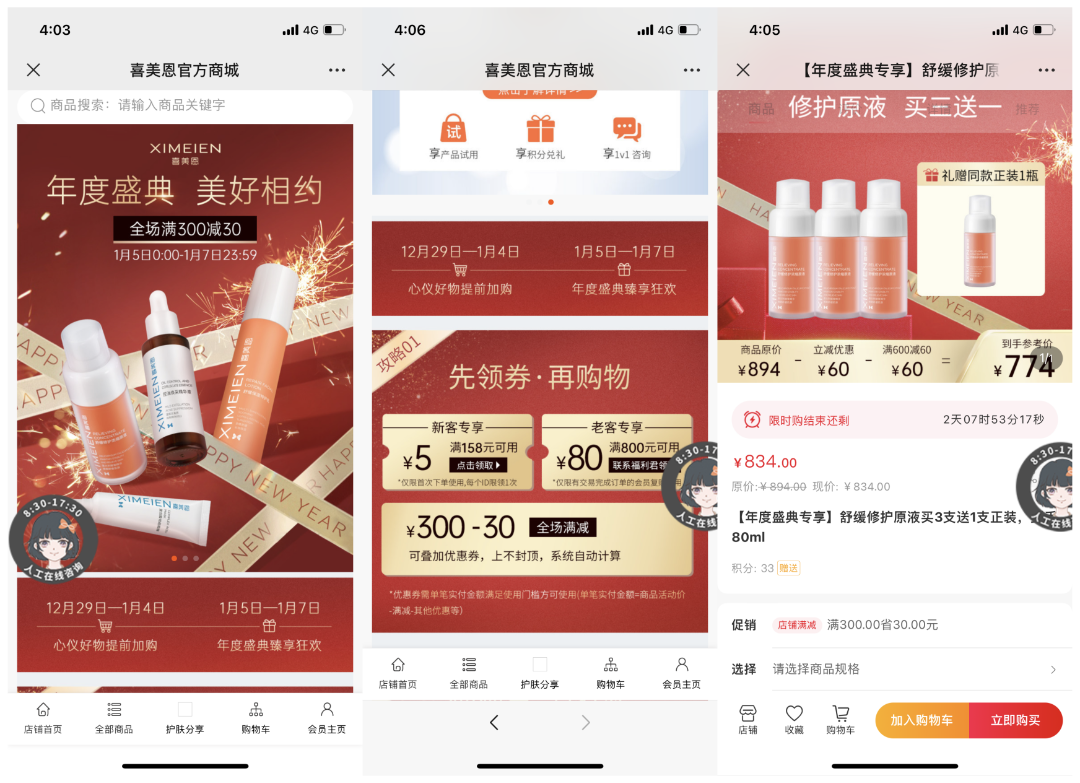 喜美恩適逢年末上新年貨節大促營銷活動,商城內會上線特惠福利給到消費者,如“滿減”、“買贈”等營銷活動。