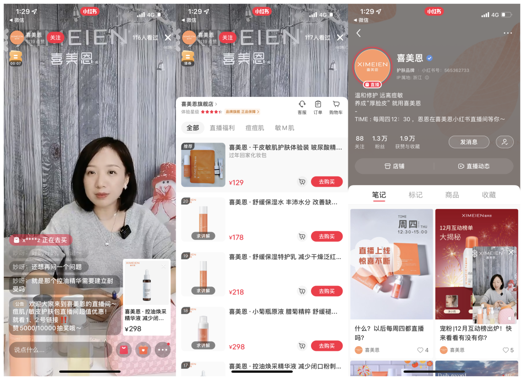 同時,喜美恩也開通小紅書商城,商品在主頁展示,開展直播帶貨,消費者可以邊看邊買。