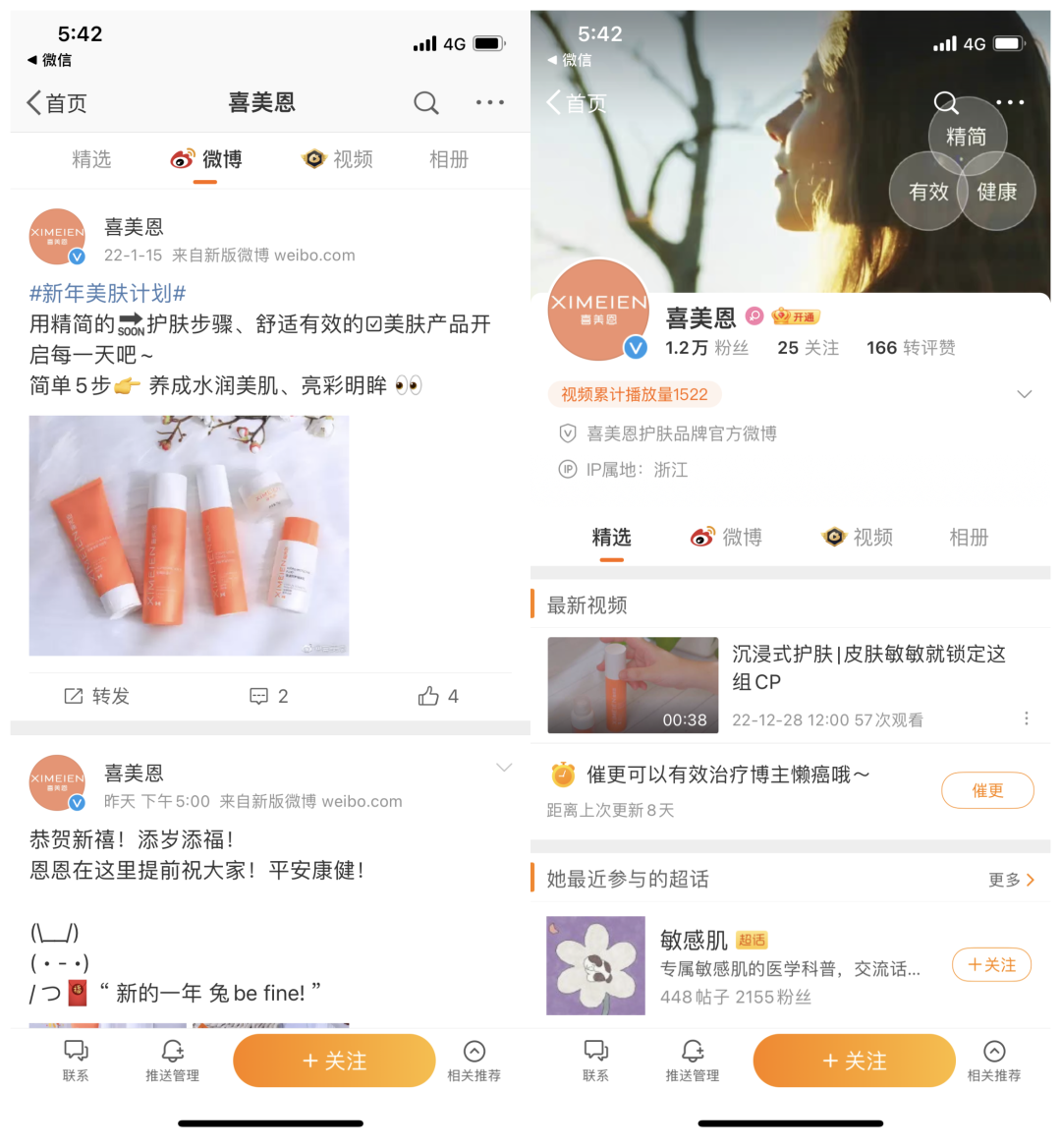 喜美恩的微博內容主要分發視頻+短圖文,內容以護膚知識+產品介紹為主,作為日常維護的一個平臺。