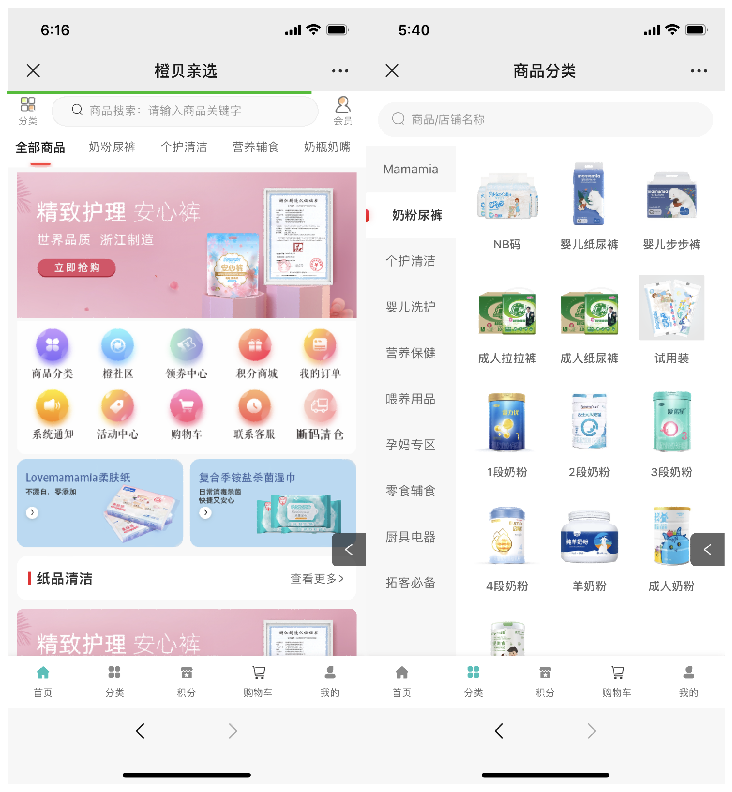 橙貝親選合作啟博微分銷系統,搭建了微商城小程序商城,一店雙核商城分布由“首頁”、“分類”、“積分”、“購物車”、“我的”五大模塊構成。