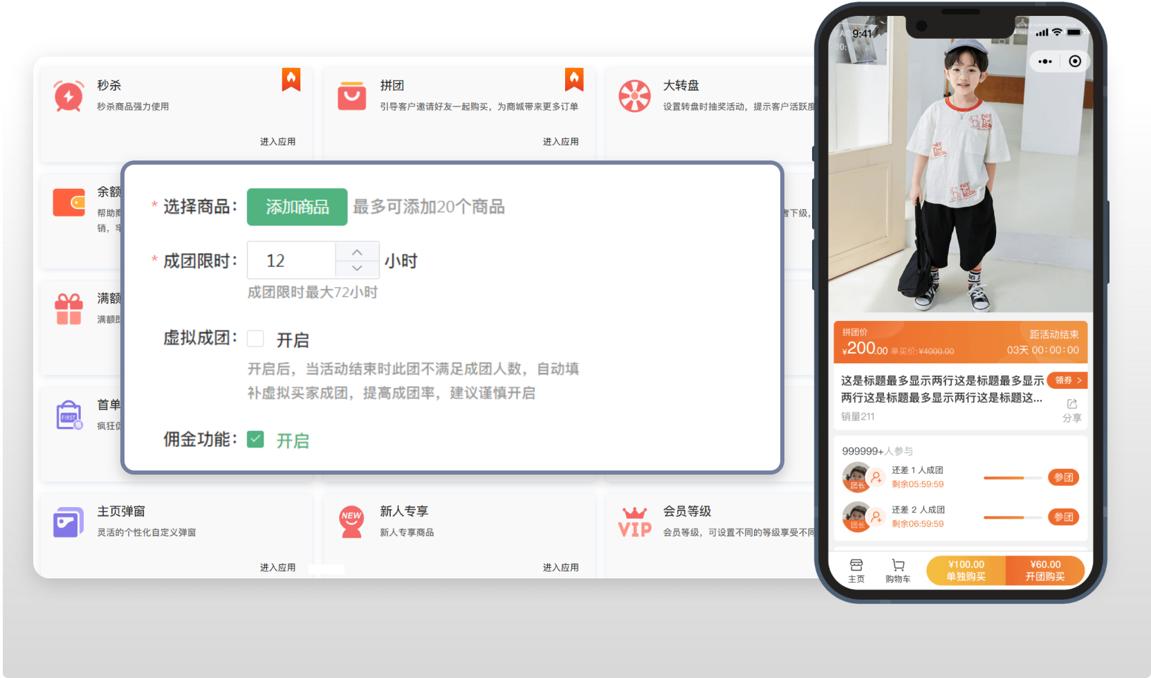 利用拼團(tuán)購(gòu)物享折扣方式,吸引客戶主動(dòng)分享、邀請(qǐng)好友、組團(tuán)下單。好友間口口相傳,不花錢(qián)也能刷爆朋友圈,為商家?guī)?lái)源源不斷的訂單和客戶。