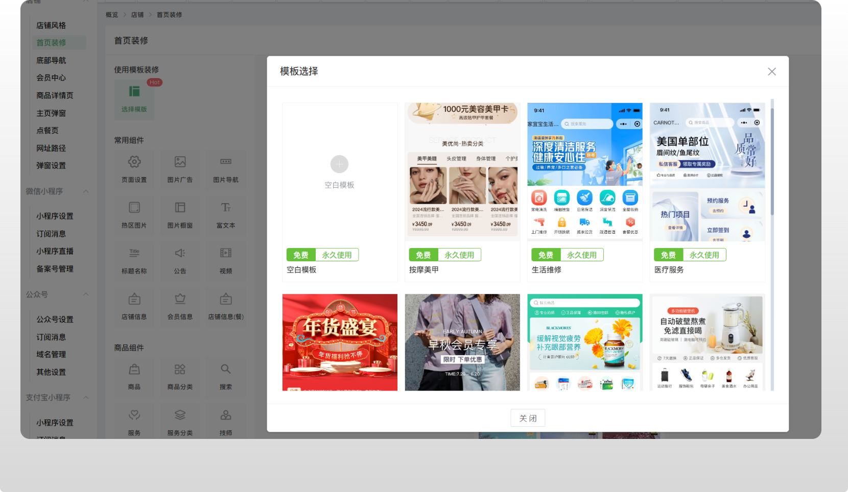 多種高端精美的永久免費模板,幫助商家解決無美工的問題,只需要簡單替換圖片也能快速裝修出高格調的小程序服務商城,實現線上快速自助式運營。