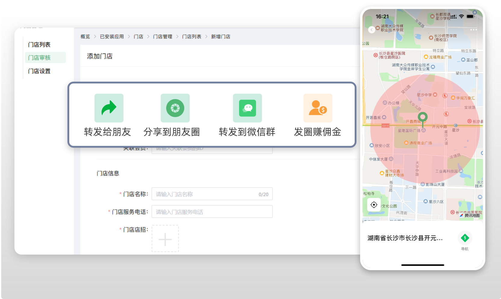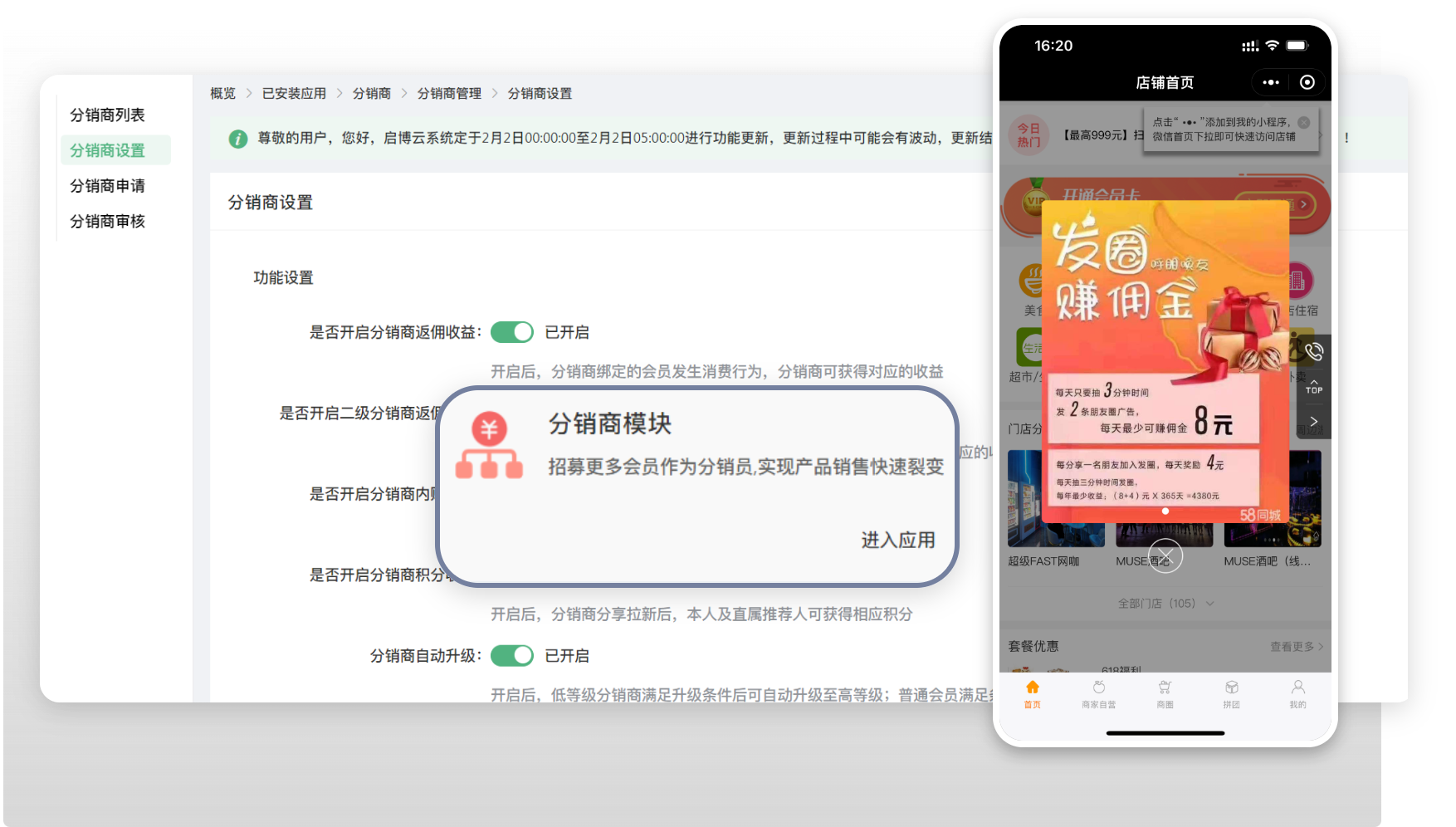 通過一體化的分銷系統和傭金體系,激勵店員/會員通過社交平臺分享商品鏈接、海報等,吸引更多的流量進入商家的線上或線下店鋪,同時店員/會員也可以獲得相應的傭金促進銷售,低成本獲客。
