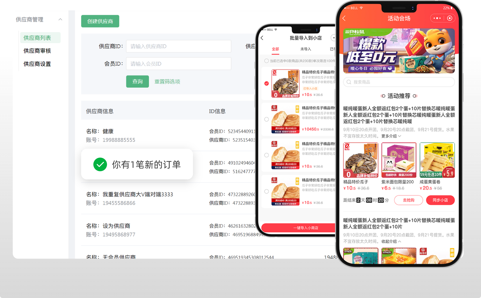 團長(上下游客戶)隨時隨地自主下單訂貨,提升工作效率;團長可一鍵批量同步商品到自有微信小商店,靈活快捷自主定價;支持多級團長、二級分傭體系,自動結算傭金,自主提現。